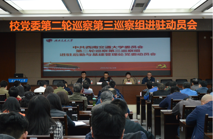 根据学校党委统一部署,3月28日下午,中共西南交通大学委员会第二轮巡察第三巡察组巡察后勤与基建管理处党委动员会在犀浦校区综合楼148会议室召开。校纪委副书记、党委巡察工作办公室主任李立,校党委第三巡察组组长贺剑、副组长吴建乐、马小荣以及巡察组全体成员出席会议,后勤与基建管理处领导班子成员、纪委委员、后基处和五个服务中心其他班子成员、“双代会”教职工代表、民主党派人士、退休党员代表以及近期退出后基处党委领导岗位同志参加了动员大会。会议由后基处党委副书记、处长宋新主持。